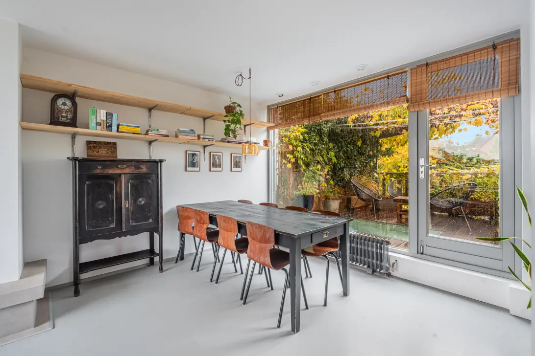Aan de achterzijde van de uitgebouwde begane grond bevindt zich de royale eetkamer. De aangebrachte lichtkoepels creëren extra licht en de harmonicapui naar de achtertuin maakt dat binnen en buiten naadloos in elkaar overlopen.