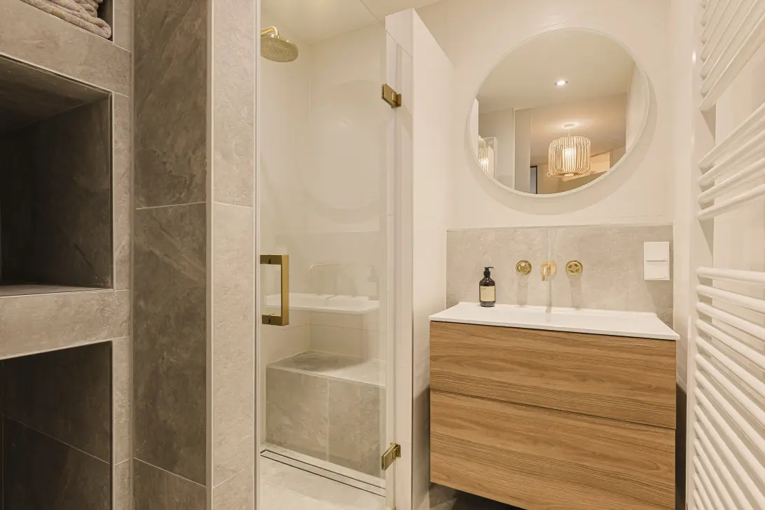 Het appartement beschikt over drie goed bemeten slaapkamers, elk met een groot raam en volop daglicht. De recent gerenoveerde badkamer is modern en strak afgewerkt, voorzien van een ruime inloopdouche, wastafelmeubel, designradiator en vloerverwarming. Daarnaast is er een apart toilet met fonteintje, en een interne berging met aansluiting voor de wasmachine.