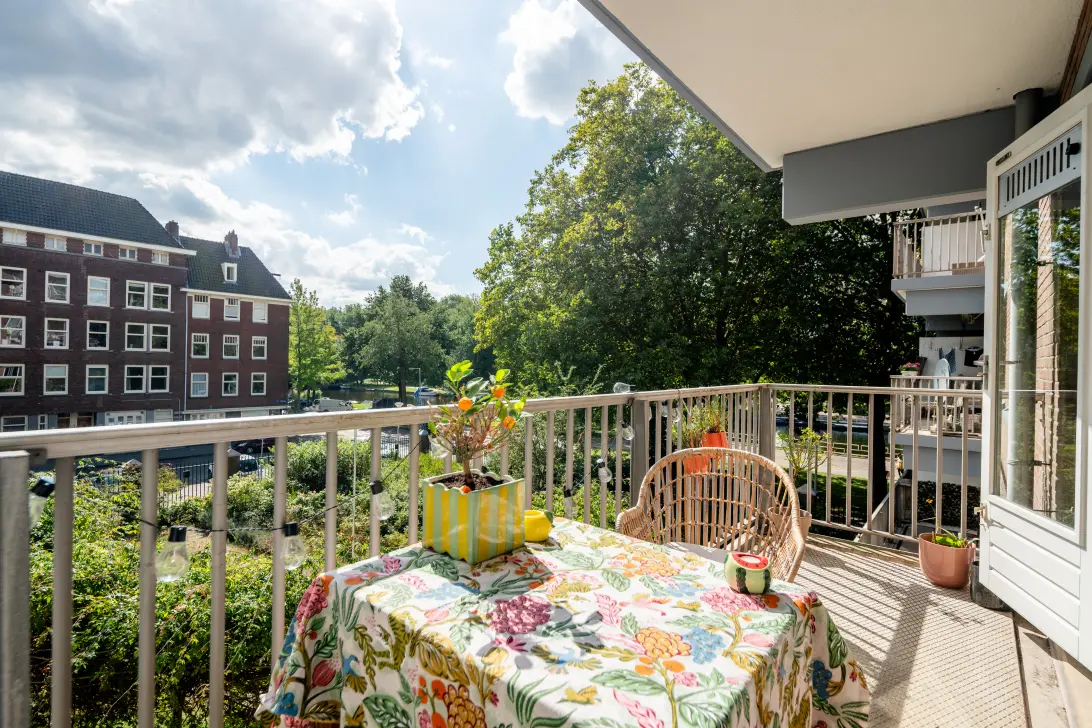 Via de woonkamer heeft u toegang tot het zonnige balkon (zuidwest) met fraai uitzicht over de Westlandgracht – een heerlijke plek om van de middag- en avondzon te genieten.