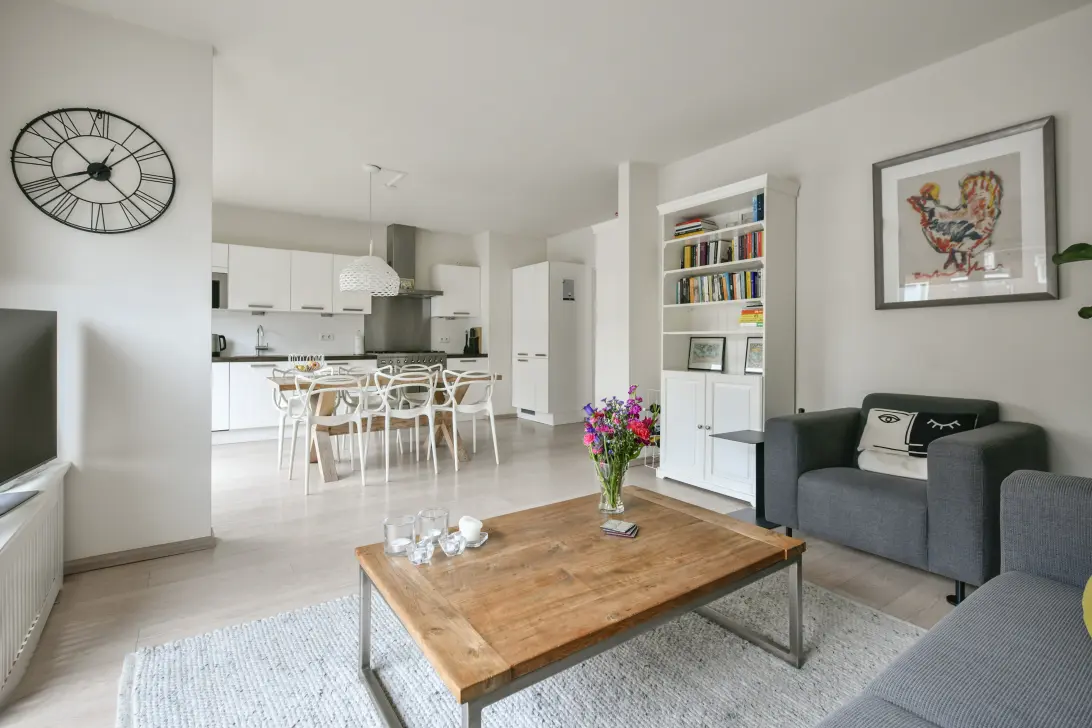 Woonkamer met open keuken aan de voorzijde, grenzend aan twee charmante balkons.
