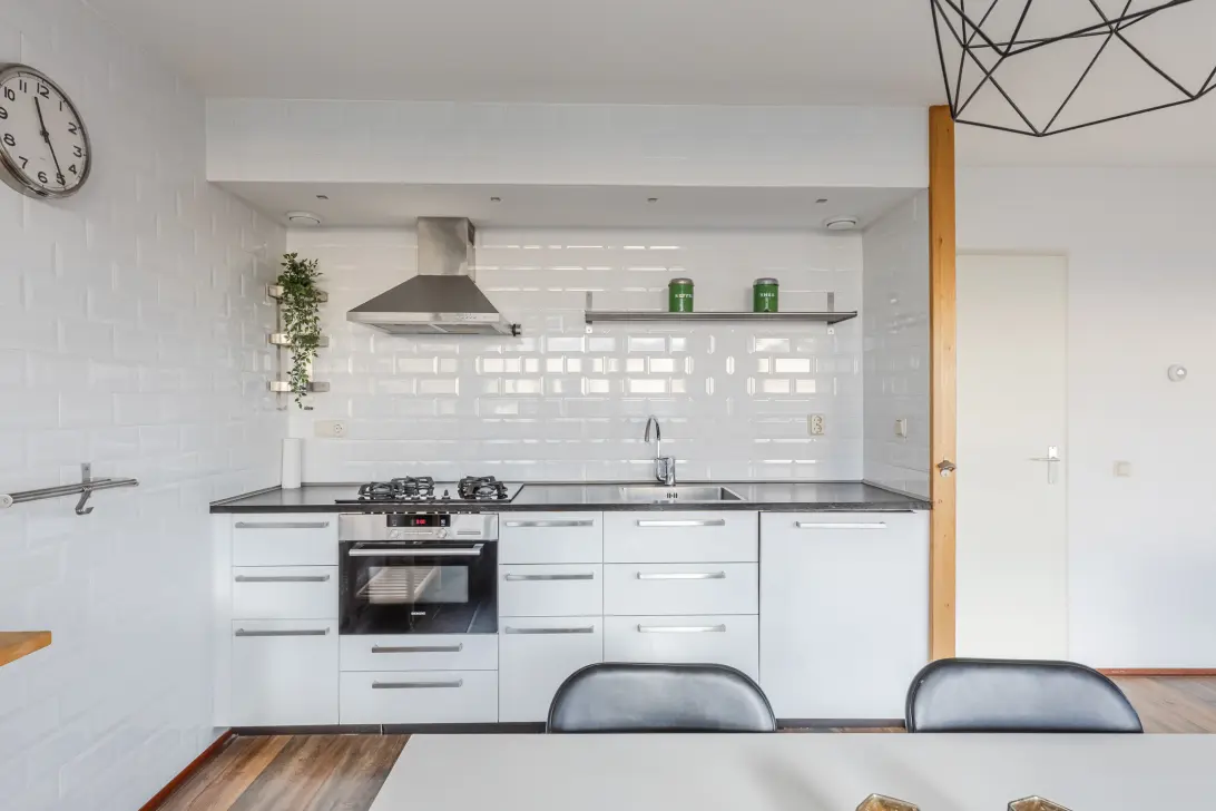 De open keuken is uitgevoerd in een rechte opstelling en heeft een strak design met witte keukenkastjes en een zwart werkblad. Hier tref je de volgende apparatuur aan: vaatwasser, gasfornuis, afzuigkap en oven. Het appartement beschikt over twee slaapkamers. Beide kamers zijn ruim van formaat, keurig afgewerkt en heerlijk licht.