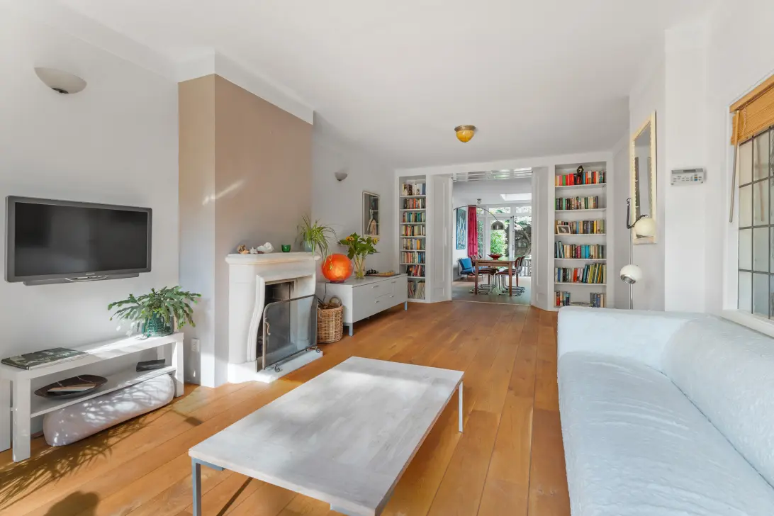 De eet- en zitkamer vormen samen een royale leefruimte en het hart van de woning, deels gelegen in de uitbouw. Het grote daklicht laat volop daglicht binnenstromen, terwijl de achterpui met openslaande deuren de tuin als verlengstuk van de woonkamer maakt. Aan de voorzijde is het zitgedeelte bereikbaar via en-suite schuifdeuren, waar de houthaard zorgt voor extra sfeer en warmte.
