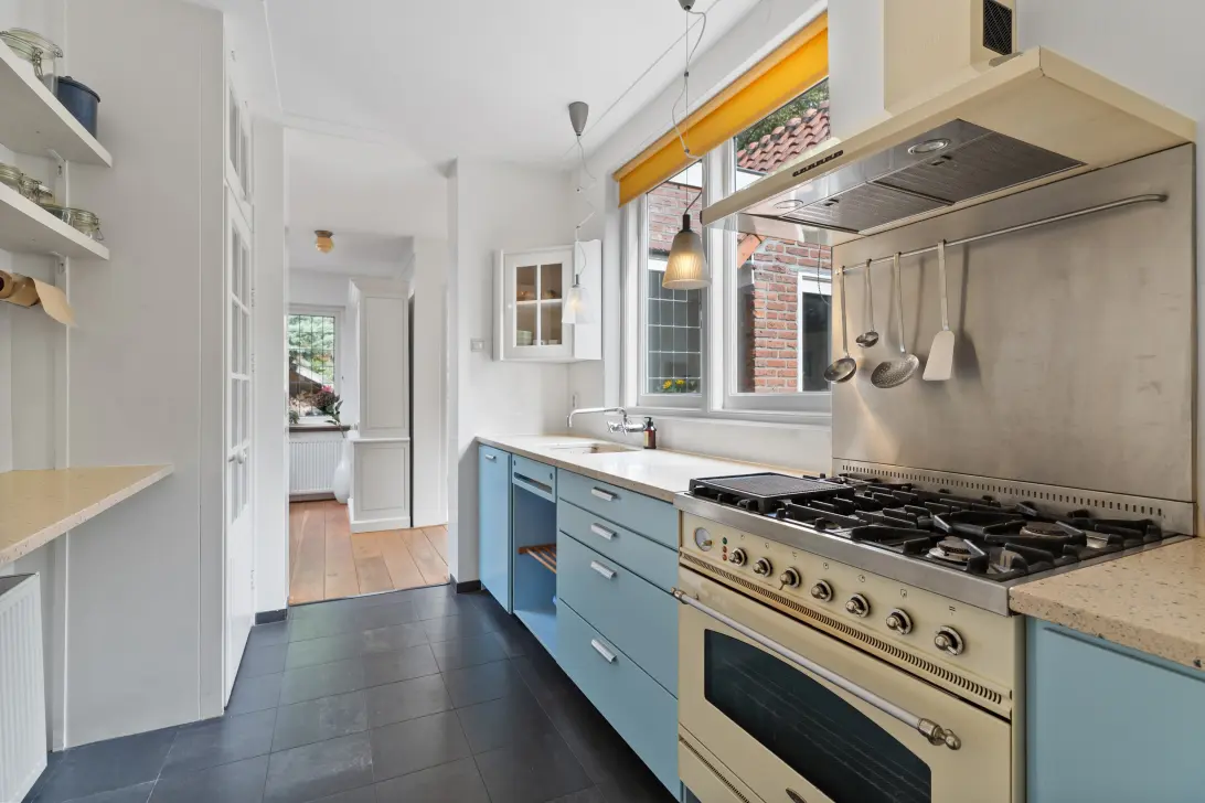 The entrance is located on the side of the house and leads to a hall with access to the spacious basement, a modernised meter cupboard and the toilet. From the hall, you enter the living room and the “Piet Zwart” retro kitchen, with a large side window that offers a beautiful view of the garden. The kitchen is practically furnished and equipped with all necessary appliances, with an authentic pantry cupboard for extra storage space. An original serving hatch – a characteristic element from the time of construction – connects the kitchen to the dining room and enhances the unique atmosphere of the house.