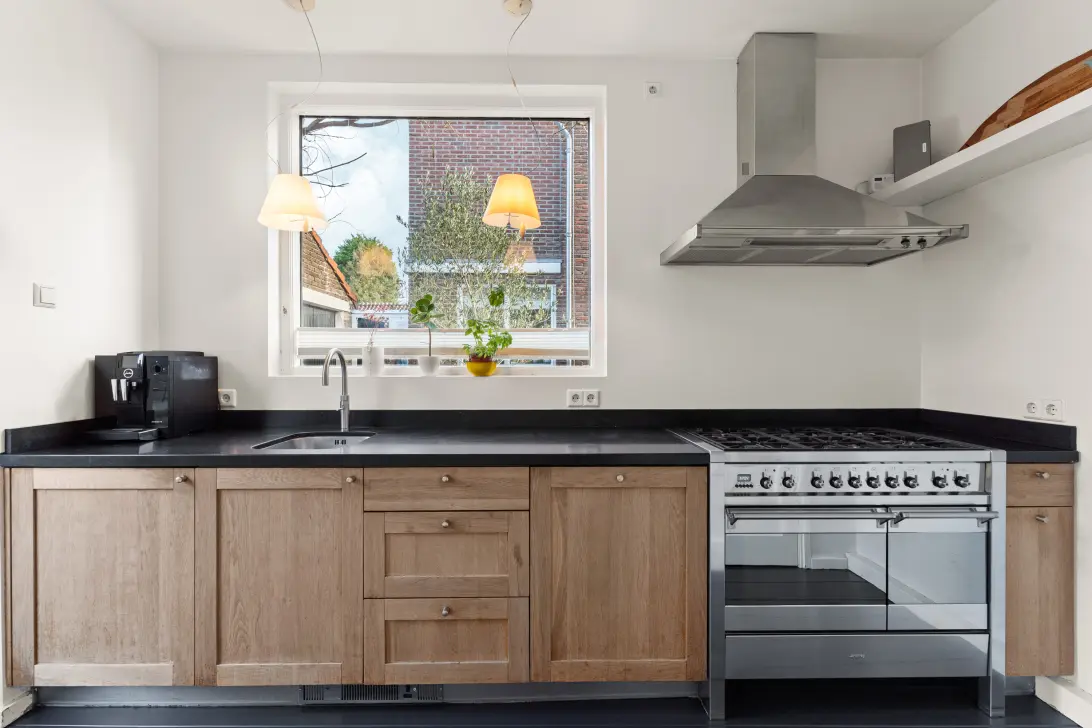De keuken is praktisch ingericht en voorzien van diverse inbouwapparatuur, waaronder een Miele vaatwasser (2021), een Smeg gasfornuis met dubbele oven, een koelkast (2024) en een Quooker (2025).