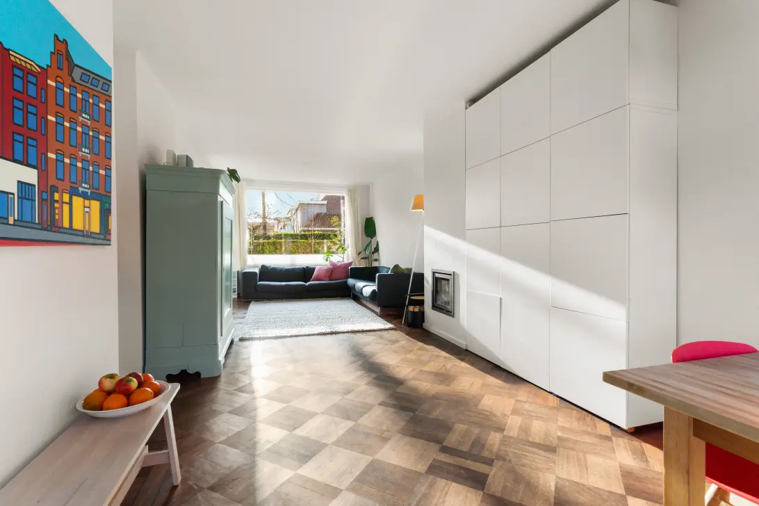 De woonkamer is licht en sfeervol en voorzien van een modern type inzethaard en de oorspronkelijke parketvloer, die hier al meer dan 50 jaar ligt. Vanuit zowel de keuken als het eetgedeelte is de achtertuin bereikbaar via openslaande deuren.