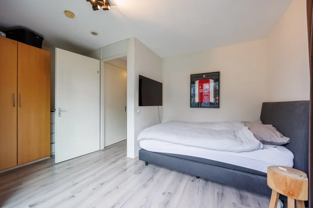 Overloop met toegang tot een heerlijk ruime en lichte slaapkamer die thans is verdeels in twee aparte kamers. De overloop biedt toegang biedt tot het ruime, zonnige dakterras op het zuiden.