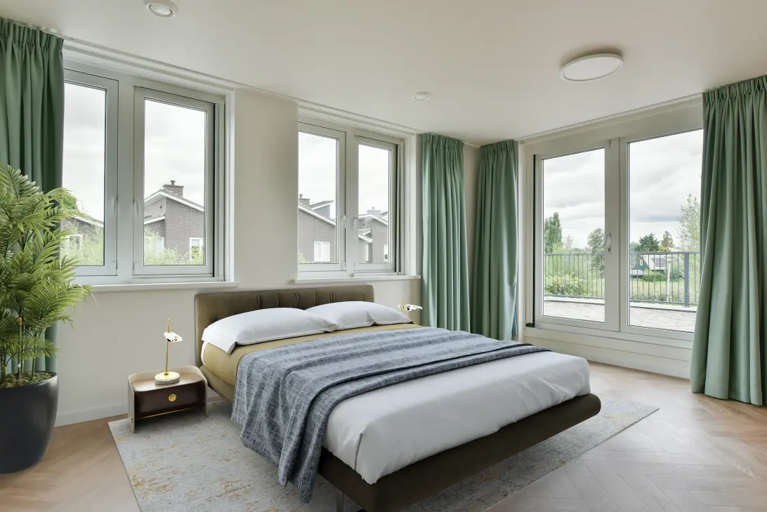 De slaapkamer aan de linkerzijde van de woning ligt boven de berging en is speels vormgegeven met een hoog plafond en ramen aan beide zijdes. De derde slaapkamer op deze verdieping ligt aan de voorzijde en heeft een prachtig uitzicht op de Ringvaart.