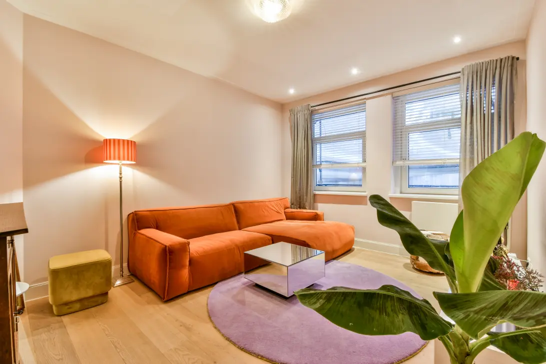 The bright living room at the front is a lovely space to relax, overlooking the quiet, car-free street.
