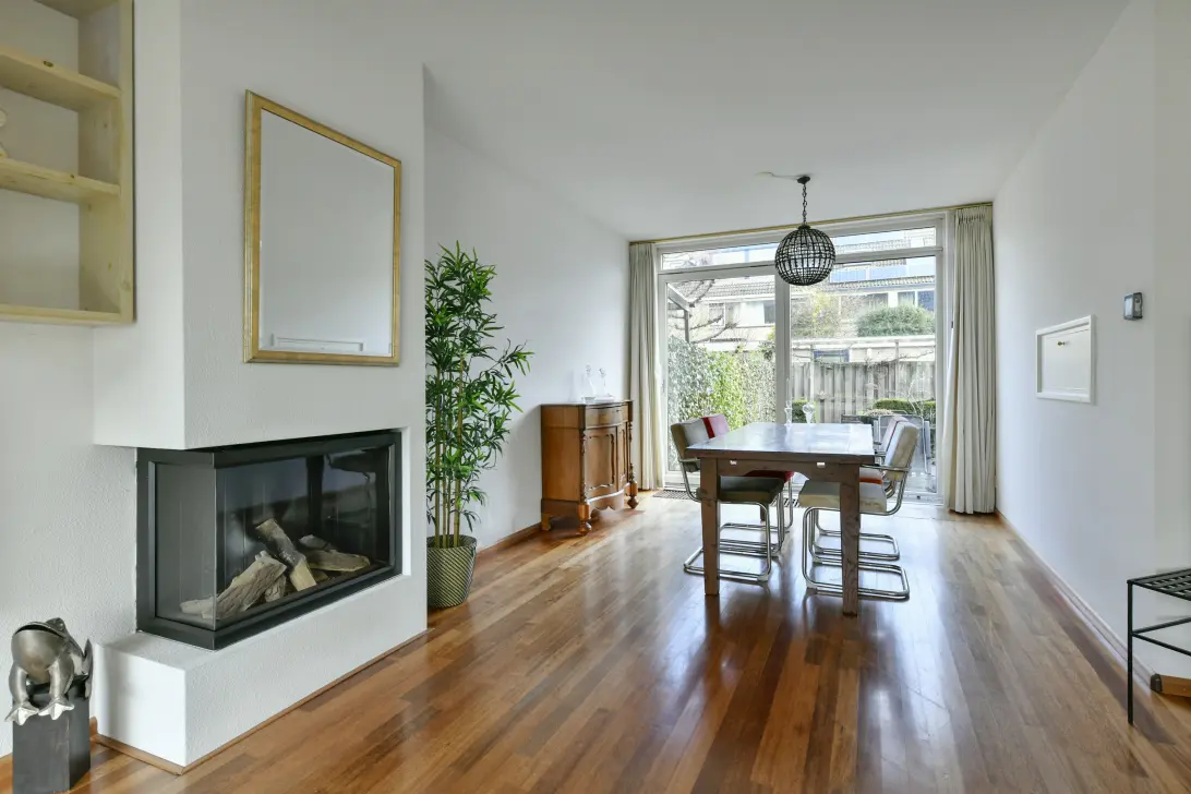 The generous living room radiates warmth thanks to the wooden floor and cozy gas fireplace. Through the sliding doors, you step into the delightful northeast-facing garden, perfect for enjoying the morning sun and long summer evenings.