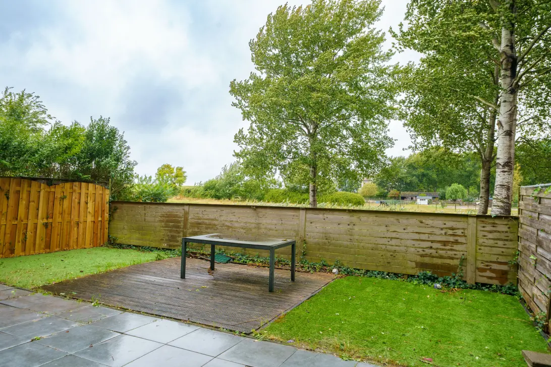 De lichte woonkamer vormt het hart van de woning. Grote ramen zorgen voor veel daglicht en een fraai, vrij uitzicht op het omliggende groen. Via de tuindeur bereikt u de ruime tuin met een groot terras, vlonder en voldoende ruimte voor meerdere zitplekken.