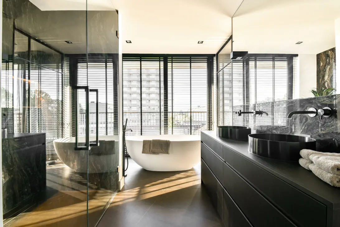 De master bedroom is aan de rechtervleugel gelegen en beschikt over een design walk-in closet, een zeer luxe badkamer en suite met ligbad met uitzicht naar buiten, dubbel wastafelmeubel, inloopdouche en separaat afsluitbaar toilet. Alles is uitgevoerd in een stijlvolle natuurstenen tegel passend bij het interieur.