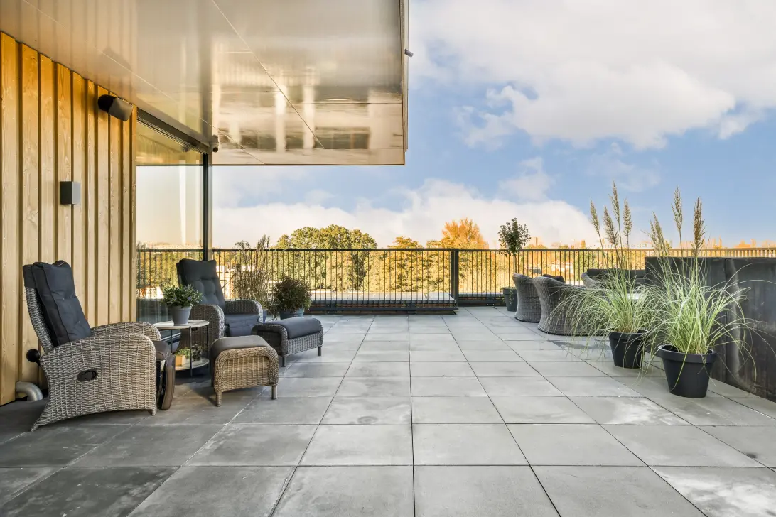 Aangrenzend aan de woonkamer en keuken is het dakterras gelegen. Deze heeft een imponerende grootte van maar liefst 228 m2 en is gelegen rondom het gehele appartement. Vanuit elk vertrek in de woning is er toegang tot dit zeer royale en unieke terras gelegen op het zuiden. Een prachtig detail om zo’n verlengde van je wooncomfort te hebben in de vorm van zo’n spectaculaire buitenruimte.