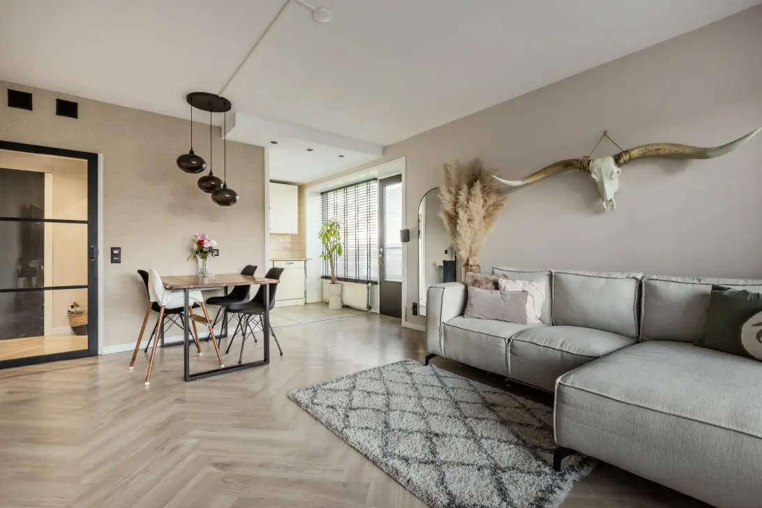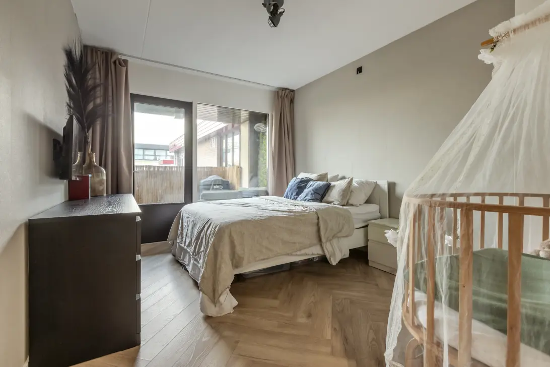 De woning is afgewerkt met een visgraatmotief laminaatvloer.