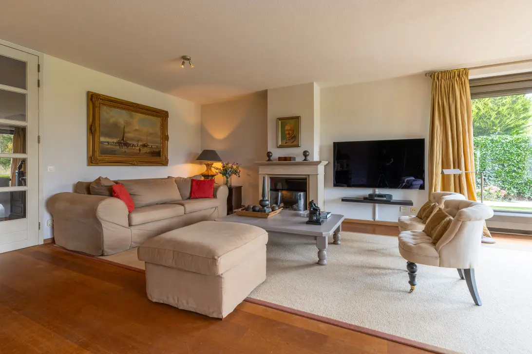 Het appartement heeft een eigen entree aan de zijkant van het gebouw en via het souterrain. De ruime hal geeft toegang tot de lichte woonkamer met grote raampartijen en schuifdeuren naar de tuin. Vanuit hier geniet u het hele jaar door van het prachtige uitzicht over groen en water. De woonkamer is voorzien van een gashaard en een massieve parketvloer die doorloopt in het gehele apVESpartement.