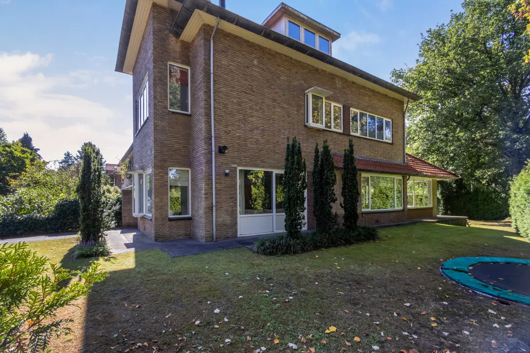 Royaal bemeten zonnige en vrije voor-, zij- en achtertuin met aangebouwde veranda en vrijstaande grote berging.