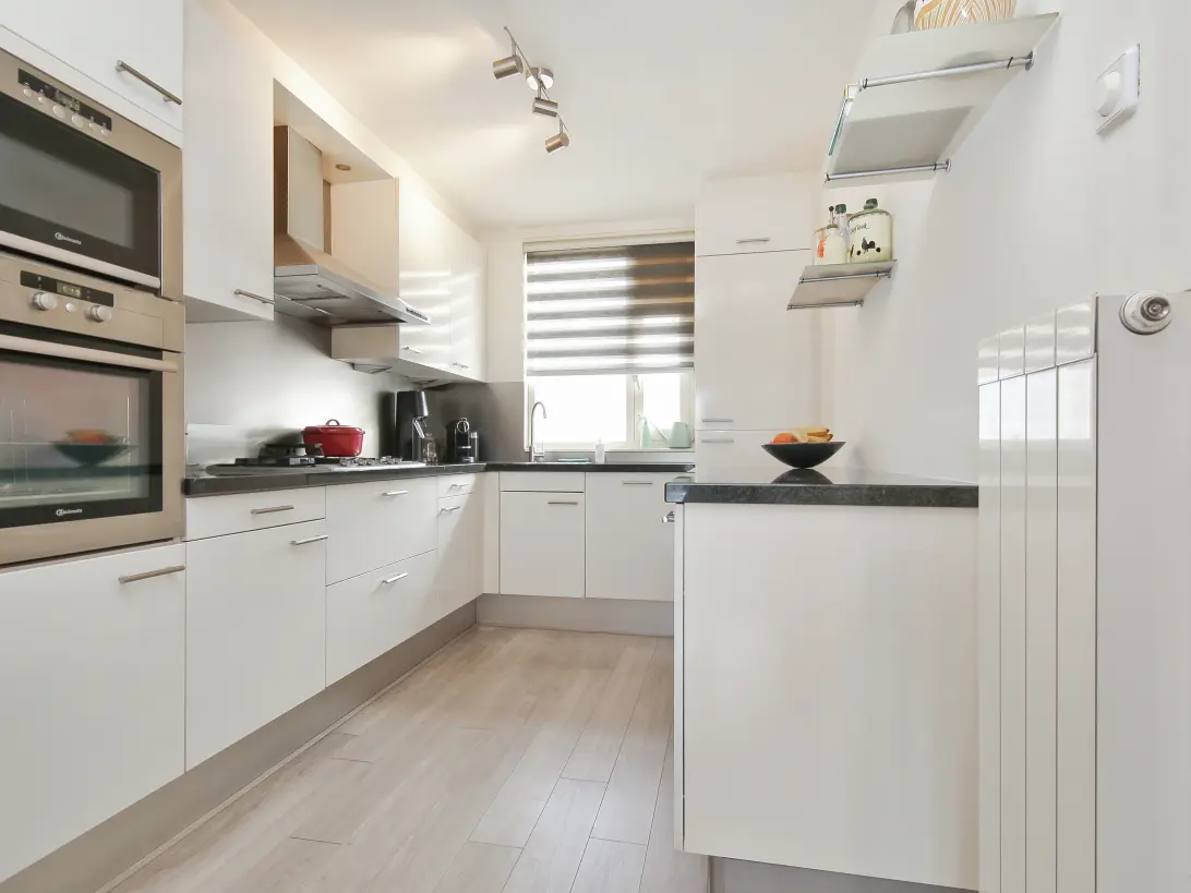 Entreehal met meterkast, apart toilet en trap naar de tweede verdieping. De lichte woonkamer van ruim 26 m² biedt via dubbele schuifdeuren toegang tot het royale westelijk gelegen balkon van 8 m². De open keuken (circa 8m²) aan de voorzijde is uitgerust met diverse inbouwapparatuur.