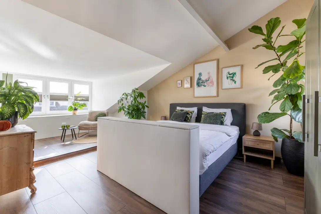 De tweede verdieping is in 2023 vergroot door de plaatsing van een kunststof dakkapel en is dit jaar volledig afgewerkt. Het resultaat is een sfeervolle slaapkamer. Daarnaast is hier ook plek voor de wasmachine- en drogeraansluiting.