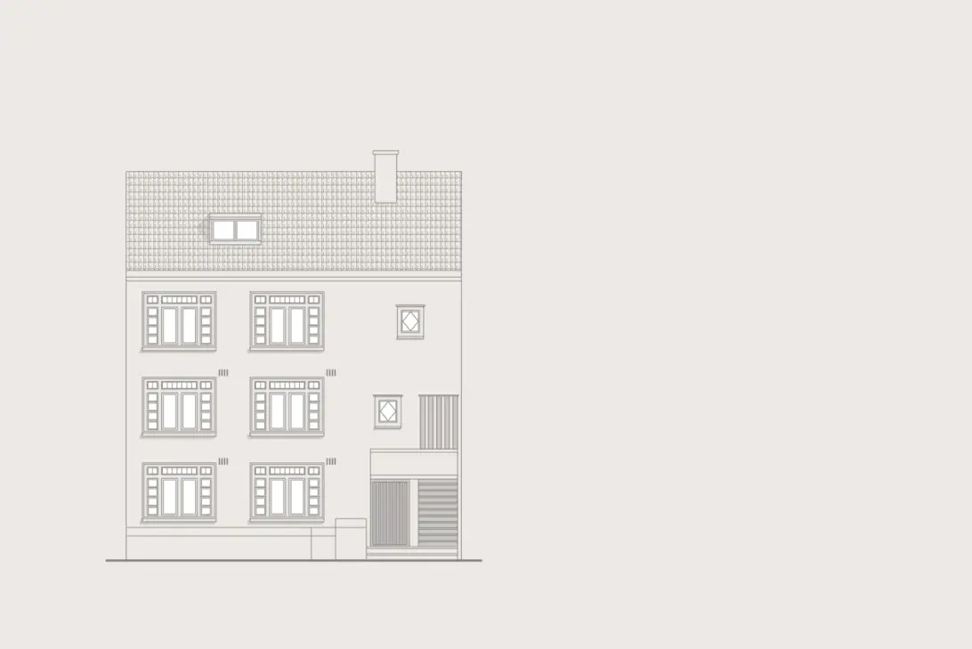 At the front lies the living room, separated from the dining area by characteristic en suite doors with stained glass, offering both spatial cohesion and functional distinction. At the rear, three to four bedrooms all open onto the balcony, with the primary bedroom divided into two sections. The adjoining room can serve as a walk-in closet, study or nursery. The spacious terrace of approximately 28 m² forms a natural extension of the living area, with views over the green inner courtyard and plenty of sunlight.
