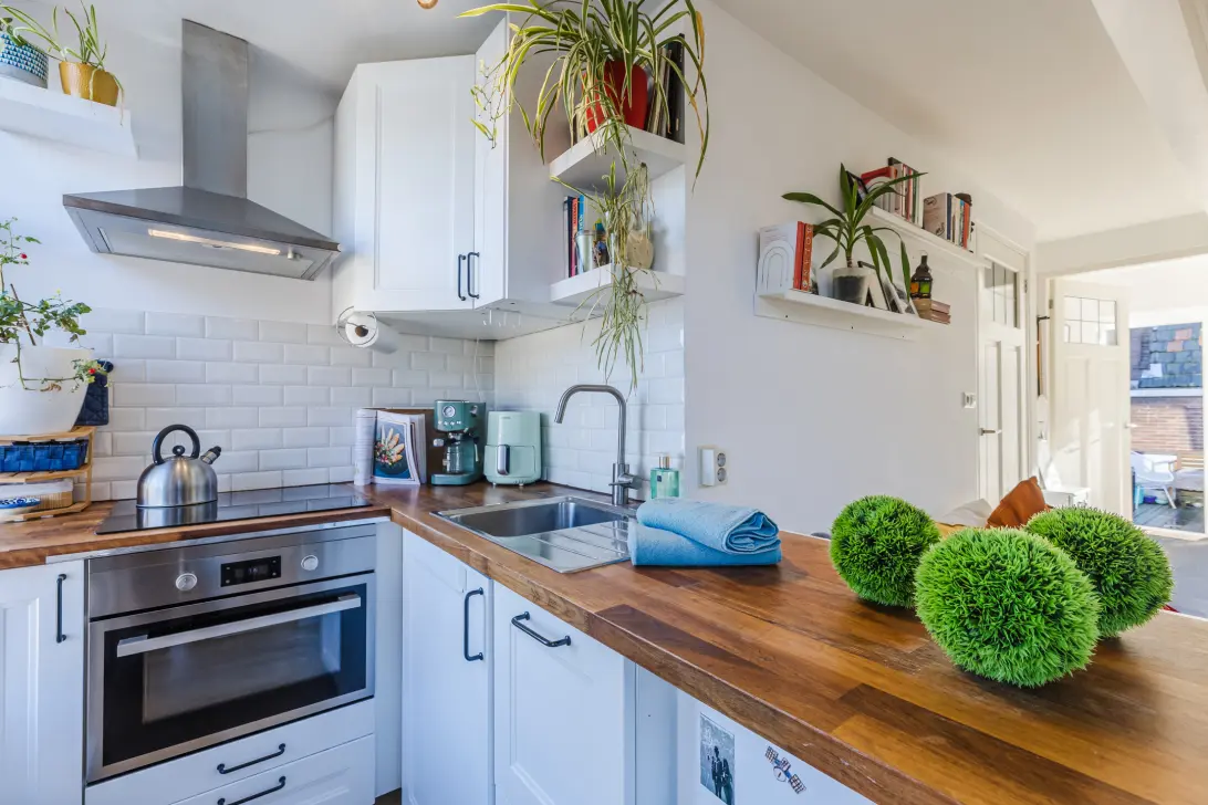 Via je eigen entree kom je boven op de overloop met direct het toilet met fontein. Vervolgens stap je de knusse, lichte woonkamer binnen, met aan de voorzijde de open keuken voorzien van inductiekookplaat, afzuigkap en combi-magnetron. De praktische kast met CV-opstelling heeft een wasmachineaansluiting, al hebben de huidige eigenaren slim extra leefruimte gecreëerd door hun wasmachine op het dakterras in een speciale kast te plaatsen.