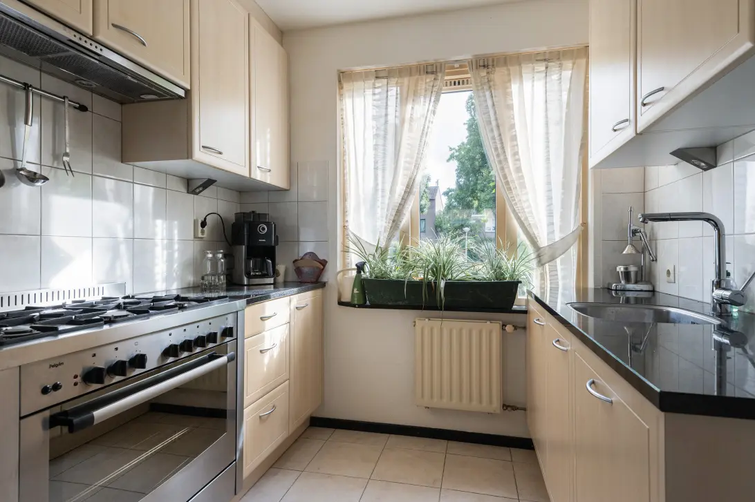 Entree, hal, wandcloset met fonteintje, meterkast, semi-open keuken (2007) voorzien van vaatwasser (2023), koelkast, vriezer, 6-pits gasfornuis met oven, granieten aanrechtblad en afzuigkap, woonkamer voorzien van laminaat vloer;