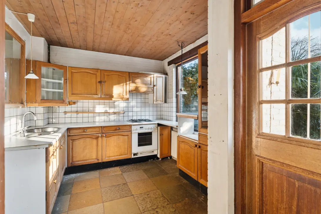 Vanuit de woonkamer komt u in de keuken. Deze dichte maar grote keuken bevindt zich aan de tuinzijde van het huis. De keuken geeft toegang tot de fijne tuin.