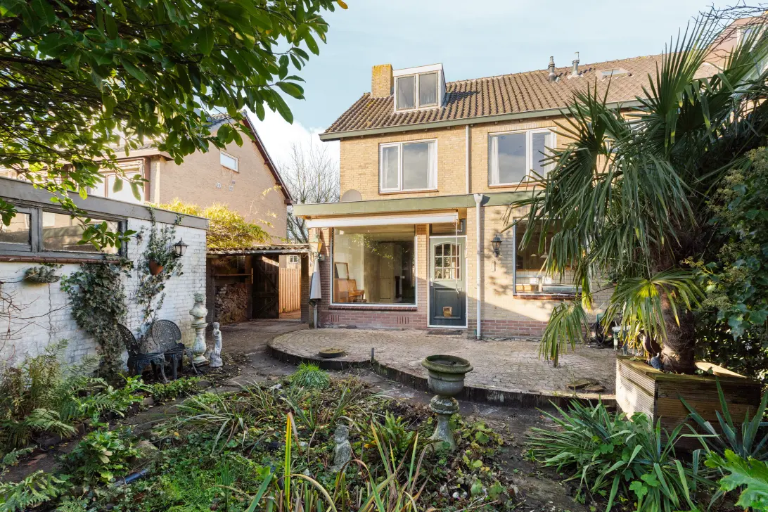 De achtertuin is opvallend groen en ruim opgezet met volwassen bomen en veel vaste beplanting. De tuin is de afgelopen jaren minder intensief onderhouden. Dit biedt een mooie kans om de tuin volledig naar eigen inzicht opnieuw aan te leggen.