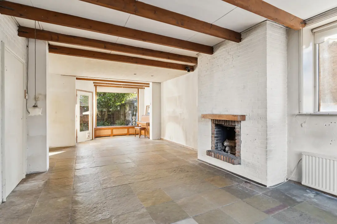 De doorzonwoonkamer heeft ramen aan de voor-, achter- en zijkant waardoor de ruimte de hele dag door licht is. Aan de achterzijde is de woning al uitgebouwd en kijkt u vrij de tuin in. De open haard vormt een sfeervol middelpunt van de woonkamer.