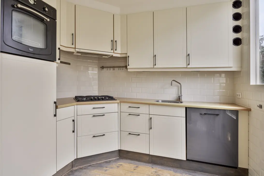 Begane grond: Bij binnenkomst treft u een entree met hal, een ruime voorraadkast, een meterkast en een modern toilet in een stijlvolle grijs/zwart/crème kleurstelling. De royale, lichte woonkamer is voorzien van prachtige houten vloerdelen, wat zorgt voor een warme en sfeervolle uitstraling. Aan de achterzijde van de woning bevindt zich de praktische keuken in een L-opstelling, compleet met een kunststof aanrechtblad en diverse inbouwapparatuur, waaronder een gaskookplaat, koelkast, oven en vaatwasser. Via de openslaande deuren bereikt u de onderhoudsvriendelijke tuin, waar een houten schuur/berging staat voor extra opslagruimte.