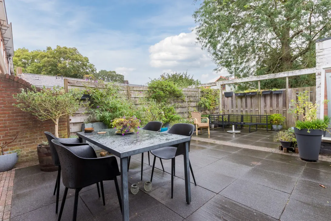 De woning beschikt over een zonnige tuin op het zuidoosten welke beschikt over een groot betegeld terras dat wordt omlijst door groene borders. Achterin de tuin staat een handige stenen berging welke voorzien is van elektriciteit. Omdat de tuin grenst aan een groenstrook, zijn er geen directe achterburen en zit je buiten heerlijk rustig, privé en omringd door groen.