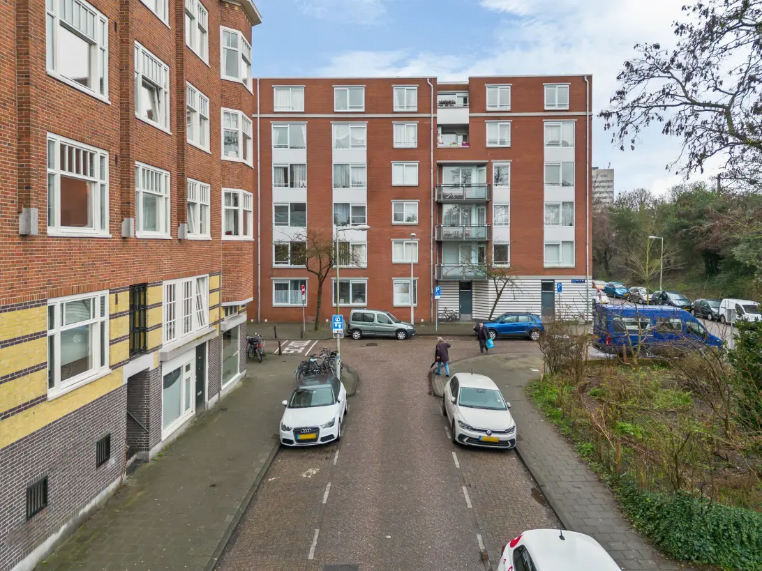 Indeling: entree, hal (met intercom), zeer lichte woonkamer met een inbouwkast, keurige keuken aan de achterzijde, keurige badkamer met toilet/wastafel/douche-cabine, grote slaapkamer aan de achterzijde en een kleine slaapkamer welke beide toegang hebben tot het prachtige balkon dat over de breedte van de woning loopt en... met een heerlijk uitzicht op de binnentuin!