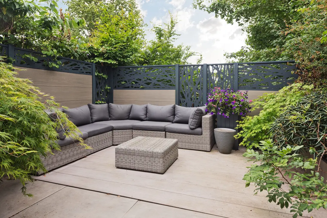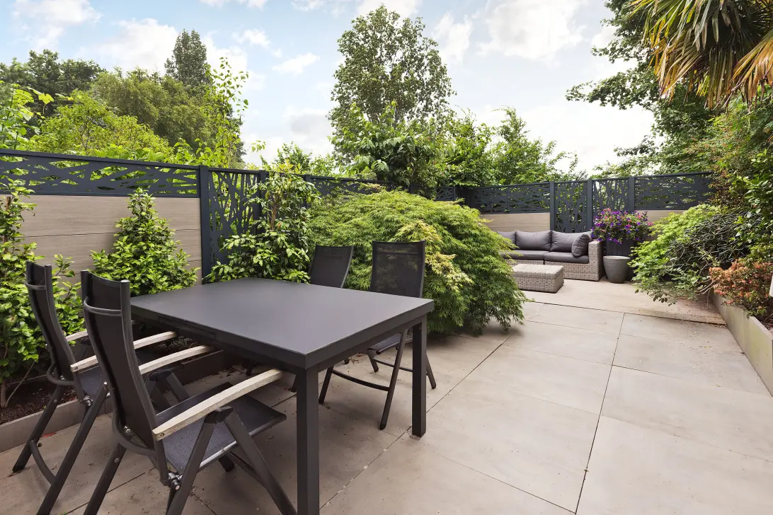 De achtertuin ligt op het oosten en is onderhoudsvriendelijk aangelegd met grote tegels, een houten vlonder en een stijlvolle erfafscheiding. Er is voldoende ruimte voor een eettafel en loungehoek. De tuin is bereikbaar via de bijkeuken op de begane grond en via een trap vanaf het balkon op de eerste verdieping.