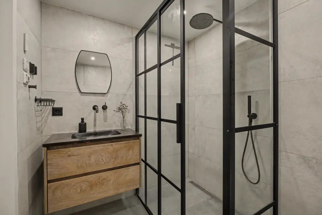 On the first floor, there are two spacious bedrooms. The modern bathroom has recently been renovated and features a washbasin, a luxurious walk-in shower, and a toilet. In addition, there is a separate laundry room and an extra space currently used for storage.
