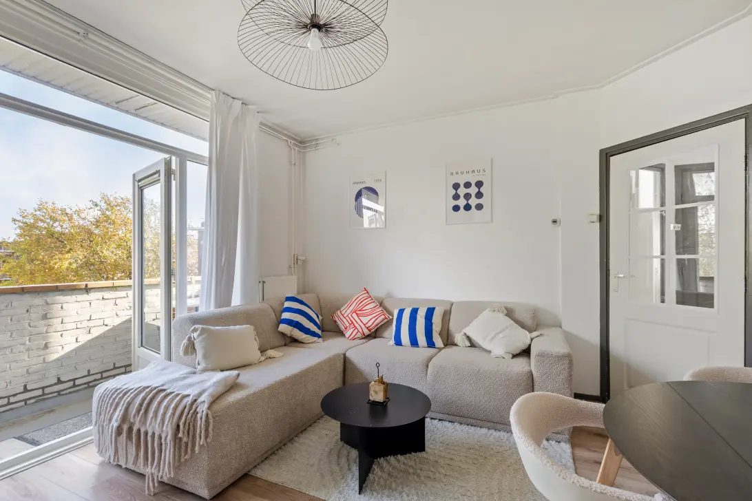 In een rustige straat, midden in het hart Bos en Lommer, ligt dit sfeervolle drie kamer appartement van 50 m² met twee zonnige balkons en een berging direct boven het appartement. Door de hoekligging, de grote ramen en het vrije uitzicht heeft het geheel een lichte en uitnodigende sfeer. Een heerlijk stadsappartement met karakter en comfort, op een plek waar alles binnen handbereik is.