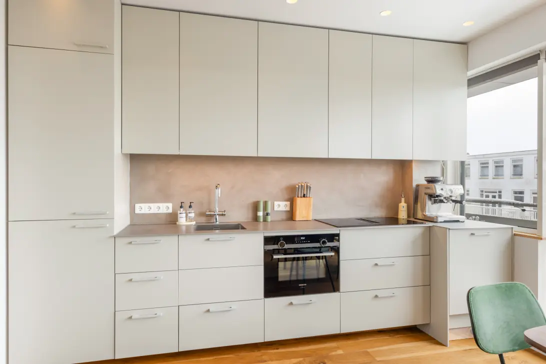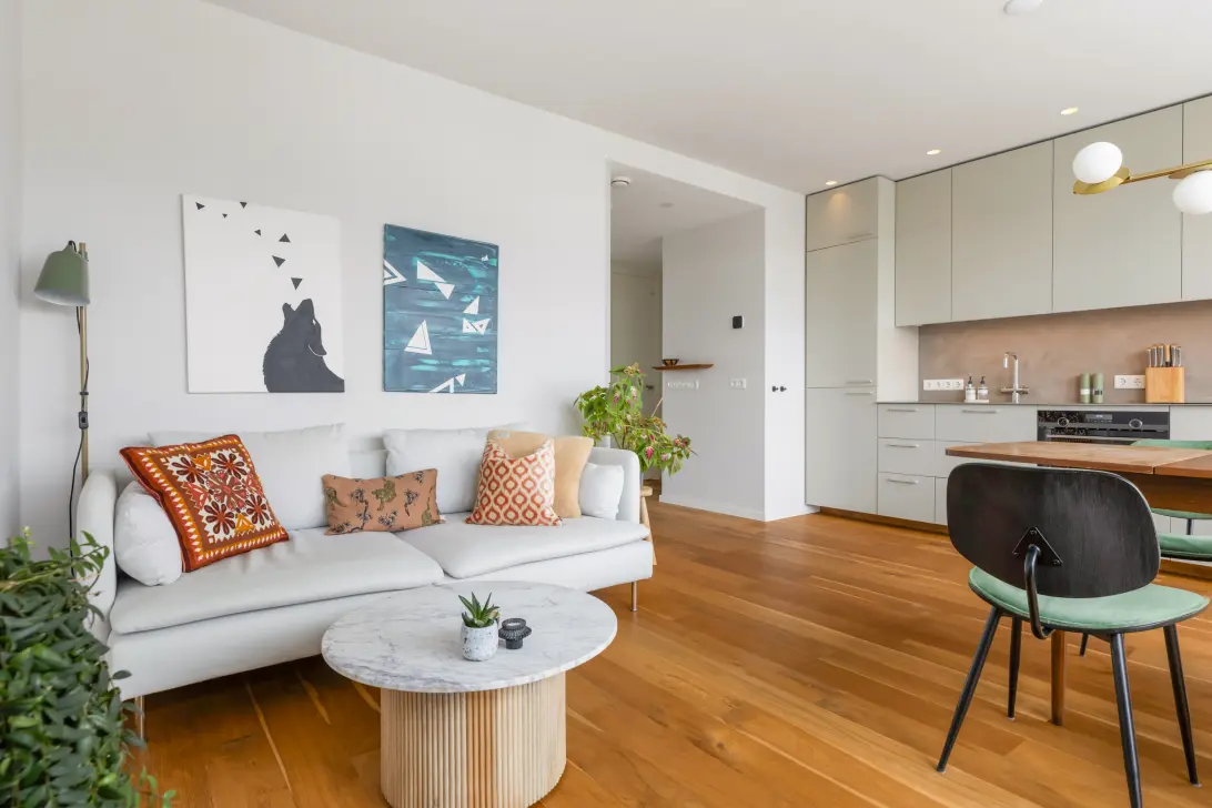 De eikenhouten vloer met vloerverwarming loopt door de gehele woning en draagt bij aan het comfortabele en verzorgde karakter van het appartement.