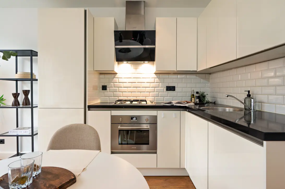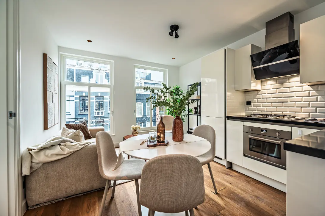 Via het gemeenschappelijk trappenhuis bereik je de entree op de derde verdieping. Je stapt binnen in een stijlvolle woning met een warme parketvloer en comfortabele vloerverwarming. De woonkamer is licht en verbonden met een open keuken, voorzien van een 4-pits gasfornuis, afzuigkap, combi-oven, vaatwasser, koelkast en vriezer.