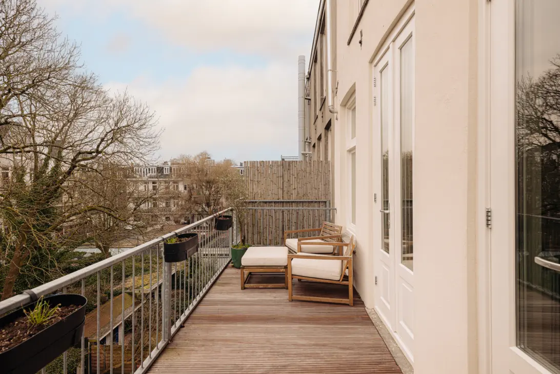 Het gemeenschappelijke trappenhuis leidt naar de entree van het appartement op de derde verdieping. Aan de voorzijde bevinden zich twee slaapkamers. Aan de achterzijde ligt de lichte en ruime woonkamer met moderne open keuken, die dankzij de ligging over de volle breedte en de grote raampartijen bijzonder prettig aanvoelt. De keuken is uitgerust met een 4-pits design gasfornuis, oven, vaatwasser en een koelkast. Vanuit de woonkamer leiden openslaande deuren naar het extra diepe terras op het zuiden, waar u uitkijkt over een bijzonder diepe, groene binnentuin die zorgt voor veel rust en privacy.