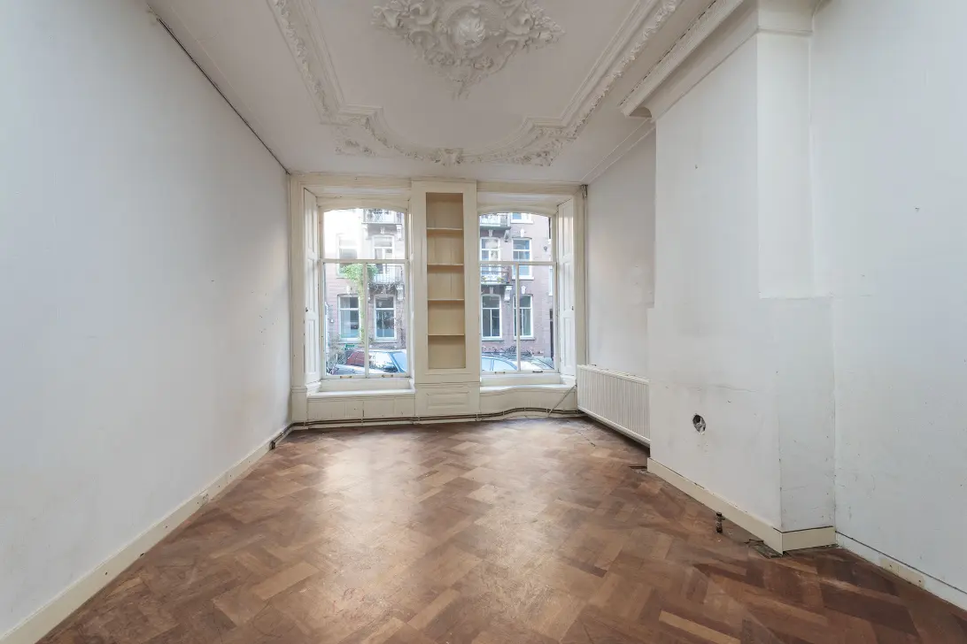 Het geheel heeft een oppervlakte van 194m2 en is verdeeld over het souterrain, de begane grond en de eerste verdieping. Op zolder bevinden zich nog twee afzonderlijke bergingen. Het huis beschikt op de begane grond over circa 3,25 meter hoge plafonds en heeft via een veranda toegang tot de diepe achtertuin op het zuiden. De eerste verdieping heeft een balkon aan de voorzijde. Het huis verkeert in een te renoveren staat. Het souterrain met een plafondhoogte van bijna 2,40 meter is voorzien van een betonnen bak en is opnieuw gefundeerd en verkeert in casco staat. Ook vanuit hier is de tuin met openslaande deuren bereikbaar. Er zijn meerdere entrees, het souterrain is toegankelijk vanaf de straat en de begane grond en eerste verdieping hebben ook eigen entrees. Het oorspronkelijke Amsterdamse karakter van het huis met originele kenmerken is voor een groot gedeelte behouden gebleven. Plafonds met het originele prachtige sierstucwerk, schouwen met sierstucwerk, prachtige paneeldeuren met fraaie kozijnen, ensuite schuifdeuren met kasten, houten raamluiken aan de voorzijde met originele houten vensterbanken en houten ramen en deuren in de gevels zorgen voor een prachtige eind negentiende-eeuwse sfeer.