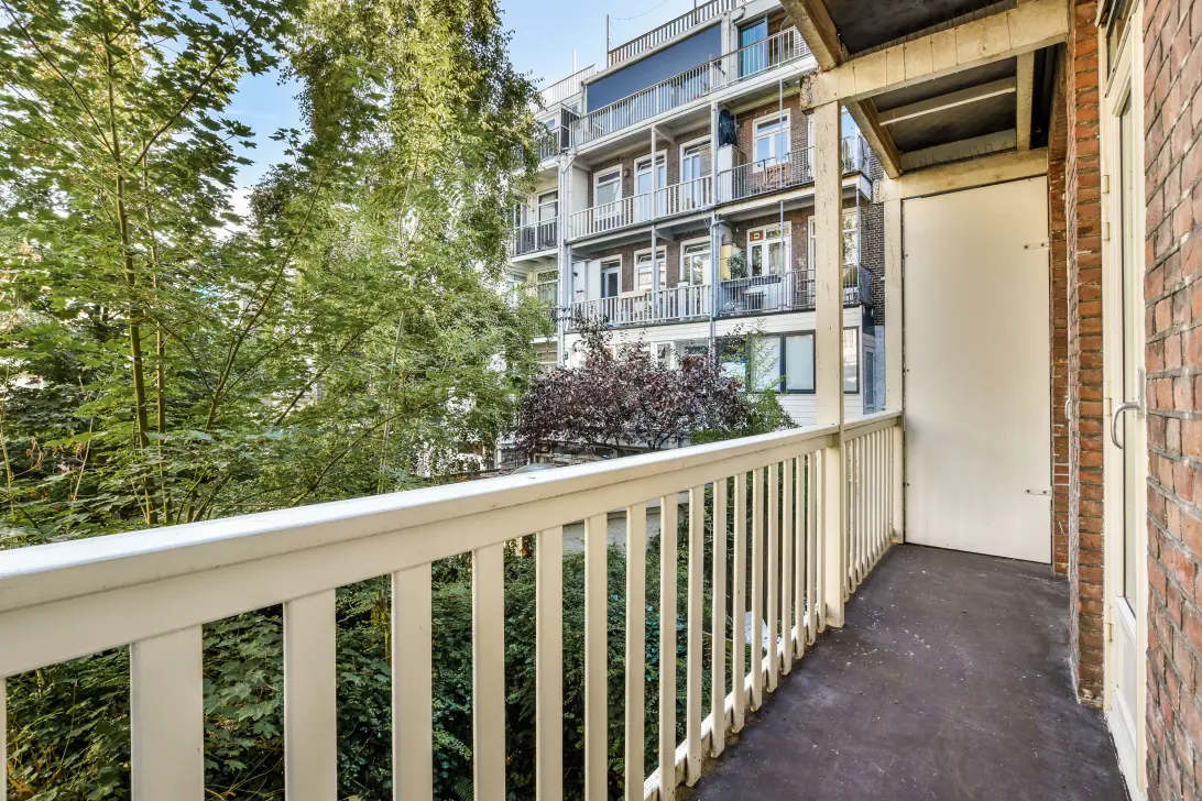 Middels schuifdeuren bereik je de ruime slaapkamer aan de rustige achterzijde, die direct toegang biedt tot het balkon. Dit balkon strekt zich uit over de volle breedte van het pand en is gelegen op het noorden, waar je in alle rust kunt genieten van de buitenruimte.