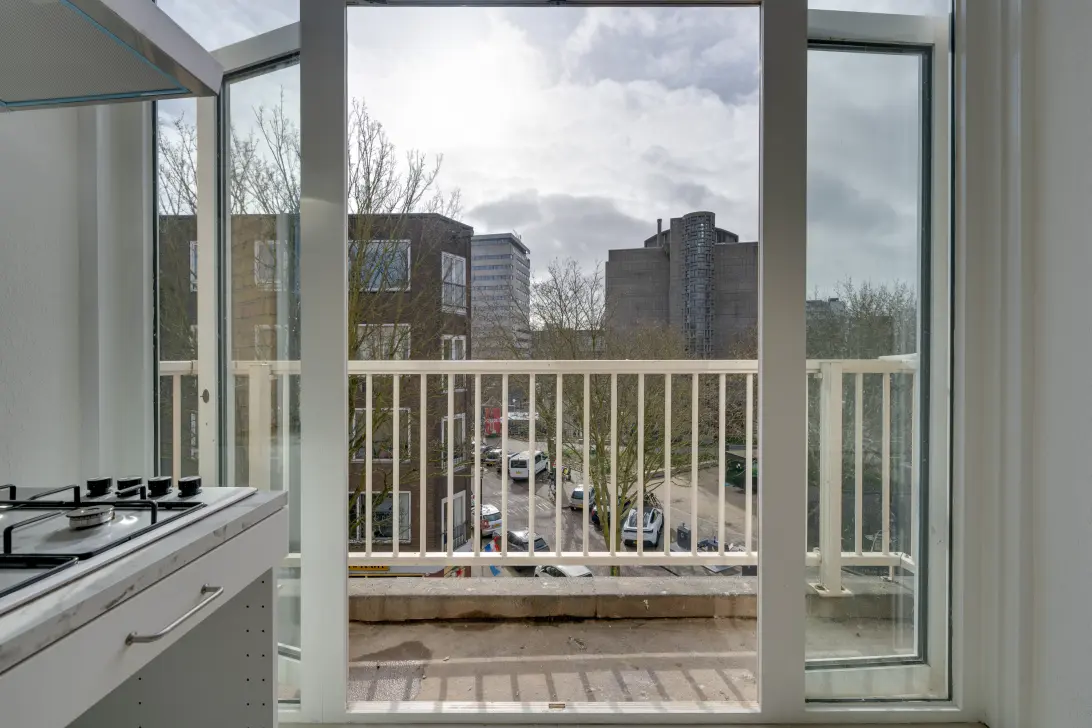 Fijn en licht 2-kamer hoekappartement, gelegen op de 3e etage met balkon (zuid!) en een plafondhoogte van 2,93 m!