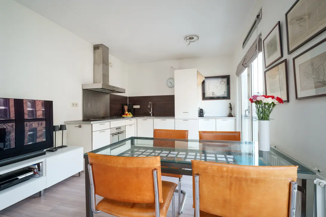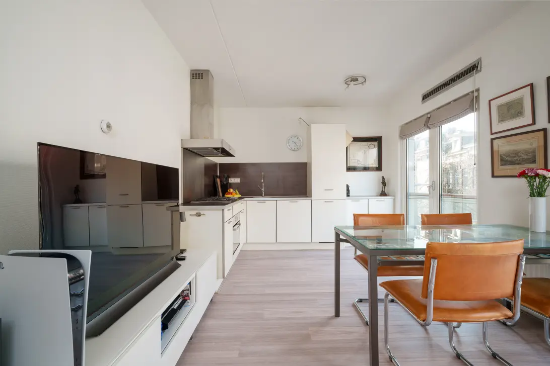 De lichte woonkeuken vormt het hart van de woning en valt direct op door de twee Franse balkons met openslaande deuren, waardoor veel daglicht binnenvalt. Hier geniet u van de middagzon en uitzicht op de bloesembomen in de straat. De keuken is praktisch ingedeeld en biedt voldoende ruimte voor een royale eettafel. Door de L-vormige indeling van de woonkamer zijn er verschillende mogelijkheden voor het creëren van een comfortabele zit- en eetruimte.