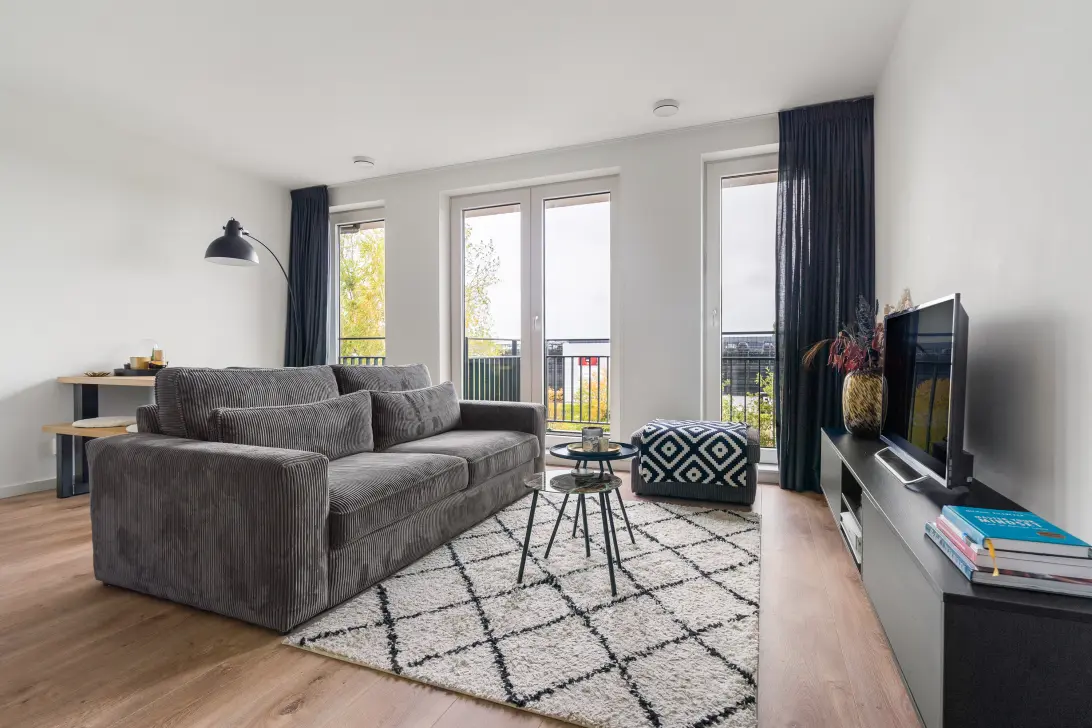 De ruime woonkamer is voorzien van een moderne vloer en geeft via openslaande deuren toegang tot het zonnige balkon op het zuidwesten. De woonkamer staat in open verbinding met de keuken, die is uitgerust met diverse inbouwapparaten. In de keuken vind je bovendien een praktische bergkast, waarin de cv-ketel en de warmte-terugwininstallatie zijn opgesteld.