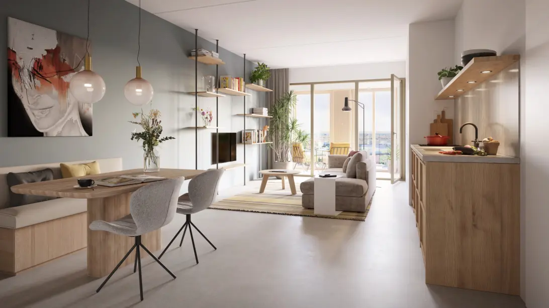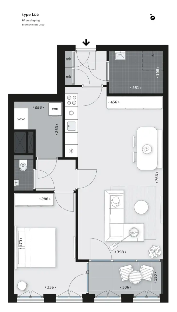 Up North appartement type Ld. Met een zonnige ligging op het zuidwesten ligt appartementstype Ld aan de Klaprozenweg. L-6-32 is het hoogst beschikbare appartement van dit type.