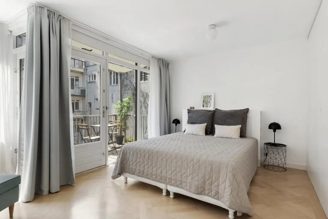 Originally the apartment was designed with two bedrooms (see alternative floorplan), currently there is one huge master bedroom that is exception large for Amsterdam’s standard. The room is fitted with a large build-in cabinet wall and has the sunny south facing balcony adjacent to be accessed by two doors (so every bedroom can access the balcony). The bright bedroom has large windows from floor to ceiling and is even large enough for some office space.