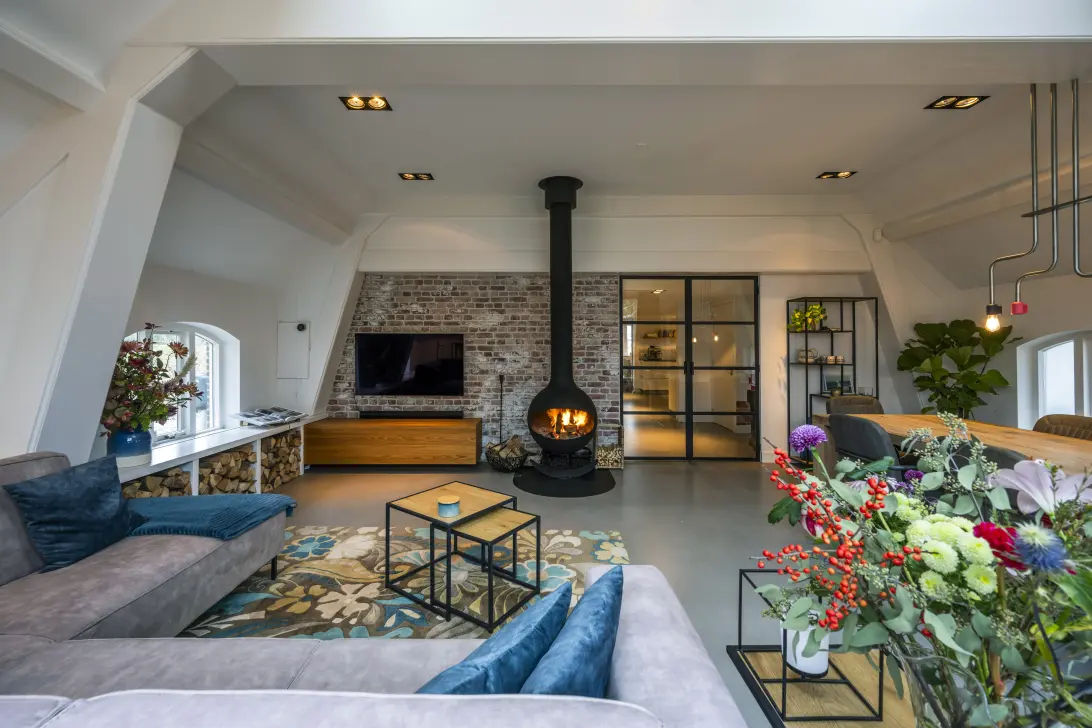 De eiken vloer, het hoge balkenplafond en de vriendelijke ramen stralen een intieme sfeer uit. Deze plek nodigt uit voor lange winteravonden, gemoedelijke kerstvieringen en uitgebreide diners.