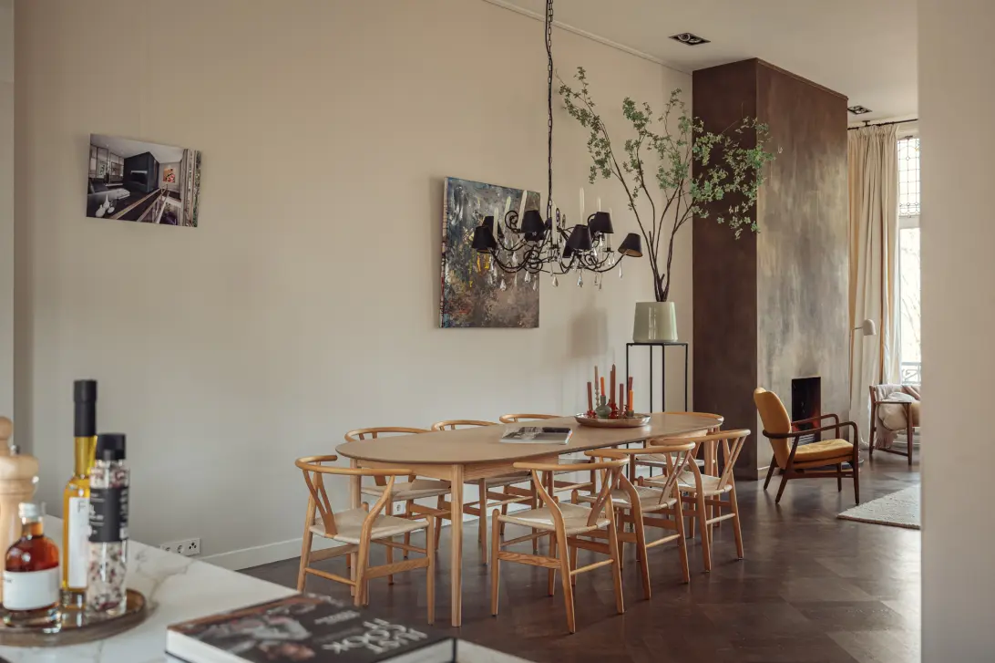 The central hall features a generously proportioned staircase connecting all five residential levels. Each floor is characterized by pleasant ceiling heights, abundant natural light, and a strong sense of space. With a total living area of approximately 410 m², the house offers extensive possibilities for multifunctional use, including living, working, and relaxation.