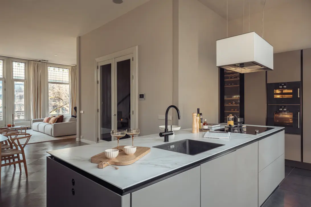 De daaropvolgende woonlaag met een plafondhoogte van circa 3.70 meter vormt het hart van het huis. Hier bevindt zich de woonkamer over de volle breedte aan het plein, met een prachtig vrij uitzicht. De luxe uitgevoerde open keuken (SieMatic) met Gaggenau-ovens en kookeiland ligt aan de westzijde, en het zitgedeelte is voorzien van een open haard. Grote raampartijen en openslaande deuren naar het balkon versterken het ruimtelijke gevoel.