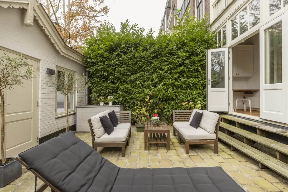 De achtertuin van circa 33 m² is gelegen op het zuidwesten en biedt veel privacy. Achter in de tuin staat een vrijstaand, volledig geïsoleerd gastenverblijf van circa 11 m² met eigen badkamer en vloerverwarming.