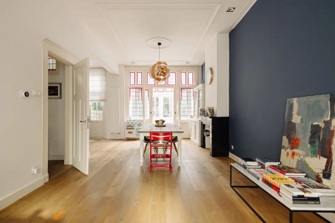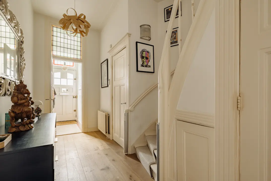De eigen voordeur op de begane grond geeft toegang tot de vestibule en de ruime hal. Hier ervaar je direct de extra breedte van het huis en het karakteristieke gevoel dankzij de hoge plafonds, glas-in-loodramen en het originele houtwerk.