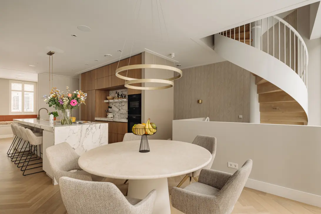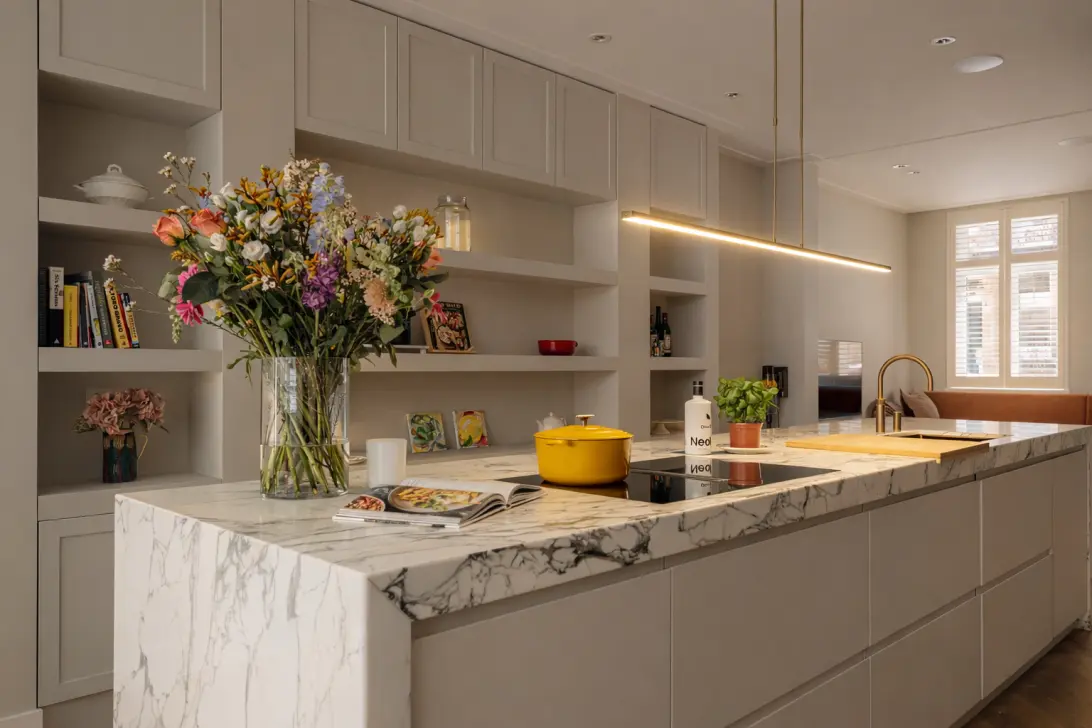 Achterin de woning opent de woonkeuken zich naar de tuin, met een imposant kookeiland, marmeren blad en maatwerk kastenwand. Aan de voorzijde: een tweede zithoek met ingebouwde bank, ideaal voor kinderen of als televisieruimte.