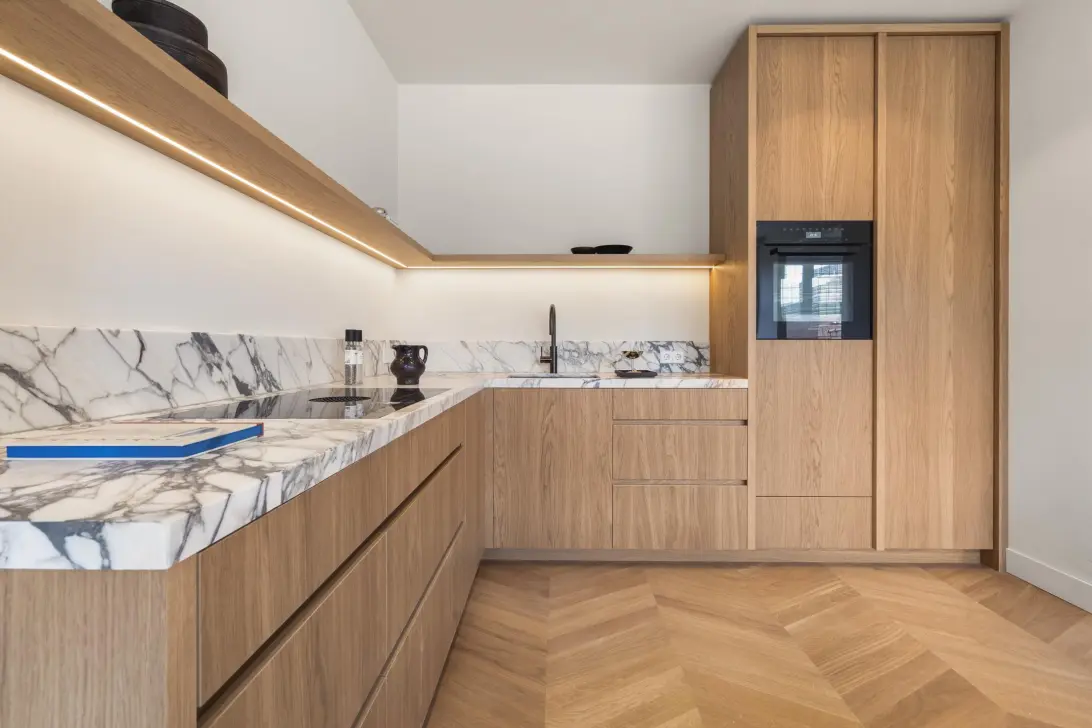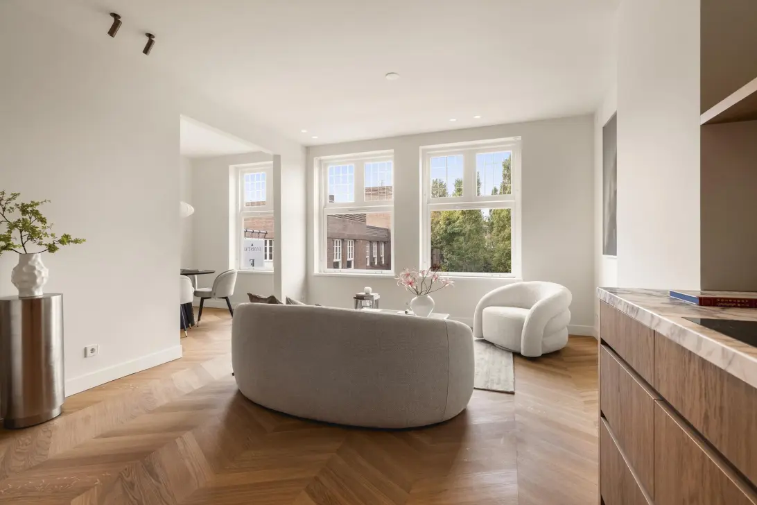 Located in a double-width Amsterdam School-style building with a lift, this beautifully renovated apartment brings together refined materials and custom craftsmanship. With Calacatta Viola and Calacatta Oro marble accents, underfloor heating, a thoughtfully designed lighting plan, and bespoke cabinetry and kitchen, this property offers a rare combination of comfort, elegance, and location in Amsterdam Oud-Zuid.